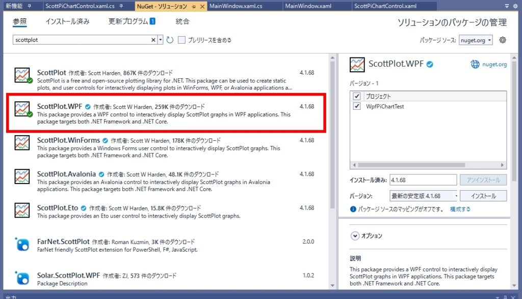 今回はフリーのチャートライブラリである ScottPlot を使いますので、NuGetによるインストールが必要です。