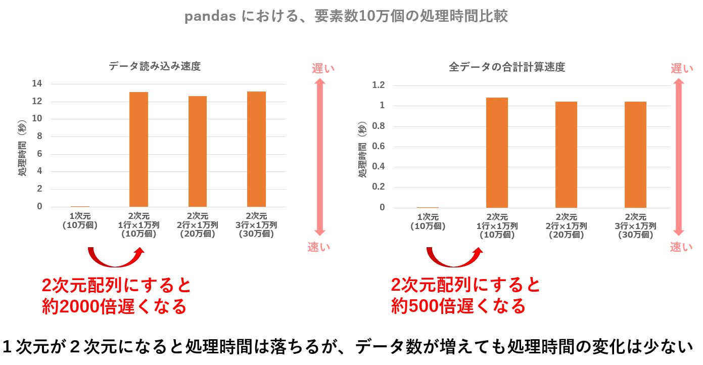 まず、単純な10万個の配列、及び1行10万列、2行10万列、3行10万列の2次元配列について、データ読み込みと合計計算の処理時間を計測したところ、2次元配列においては pandas の速度低下が著しく、numpy の方が数千倍も高速になるという結果になりました。